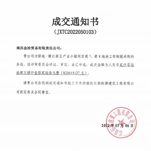 在乐鱼(中国)领导、各相关部门的帮助和配合下,贸易市场化业务陆续取得了新进展。4月14日,控股公司在中建五局2022年度江西南昌区域商品砼联合集中采购招标中脱颖而出,成功中标,合同总金额约2亿元;4月份与南昌市市政公用项目投资建设有限公司下游合作单位江西省佳升实业有限公司、江西省洪鑫源矿业有限公司签订钢材及电解铜贸易合同累计约2.11亿元;5月7日,控股公司成功中标江西标旗建筑工程有限公司绿地•赣江新区产业小镇项目商7、商8地块工程钢筋采购项目。